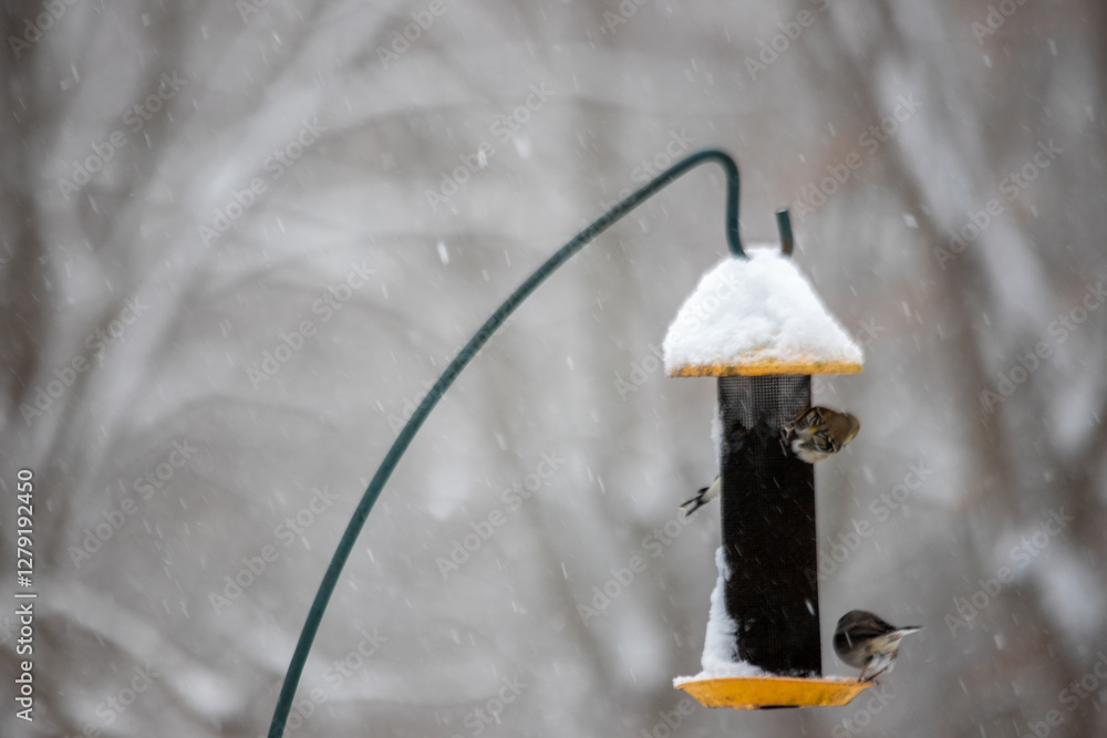 yellow american goldfinch on niger thistle seed feeder during a winter snow storm in southern Maryland Calvert county use