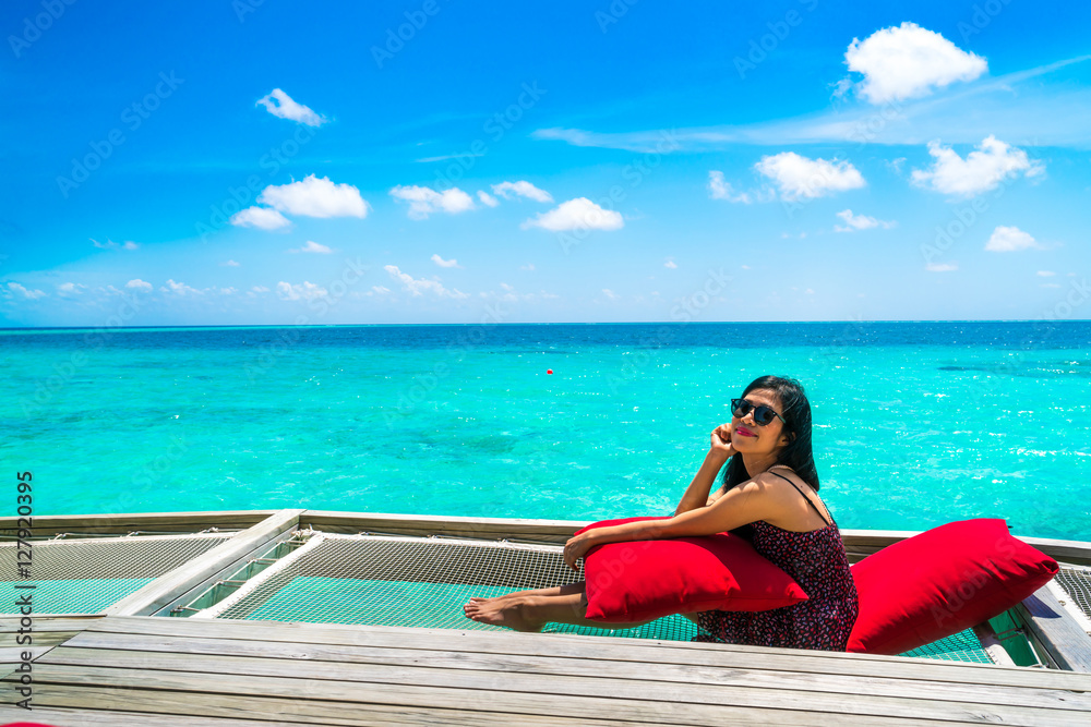 Portrait of happy young woman at beautiful water villa at Maldiv