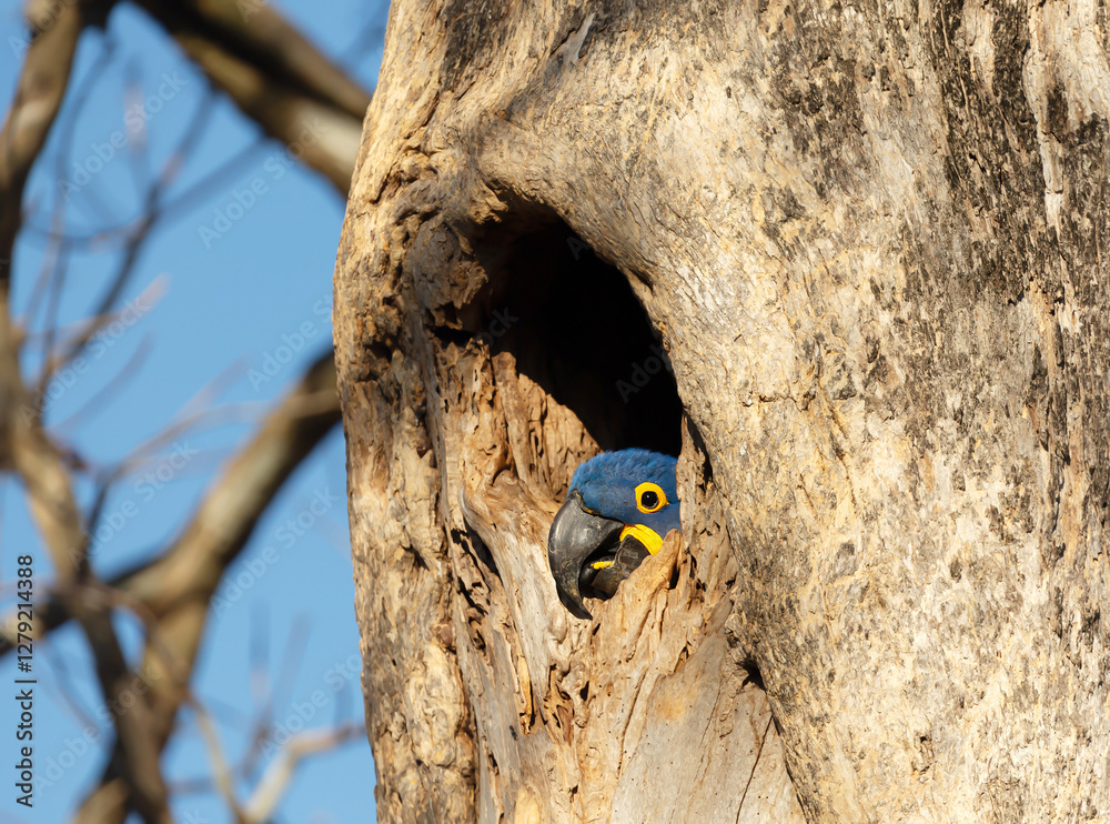 Hyacinth macaw nesting in a palm tree