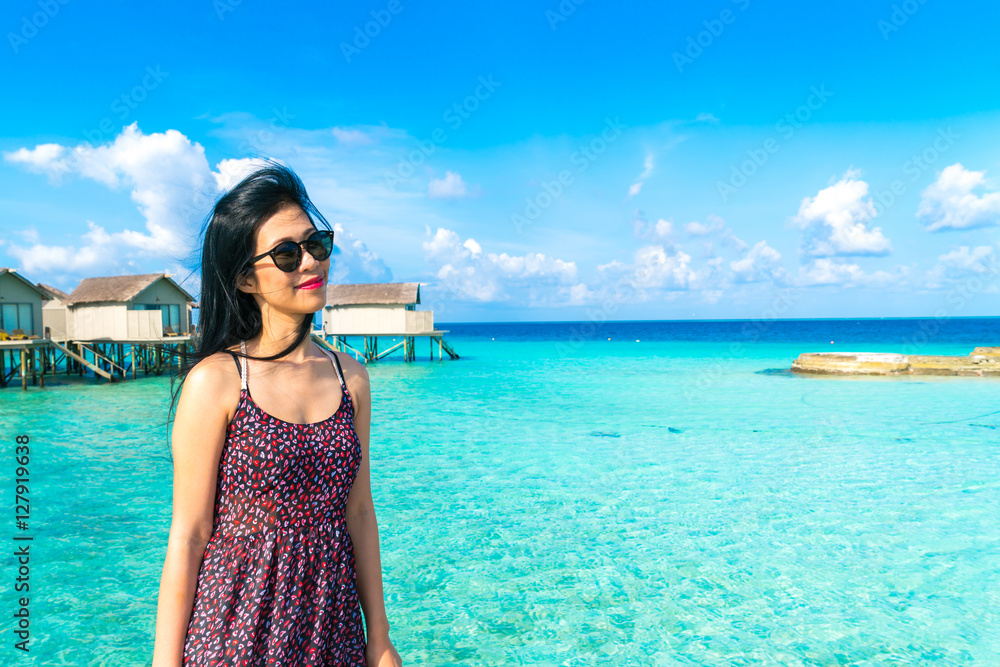 Beach chairs with umbrella at Maldives island, white sandy beach