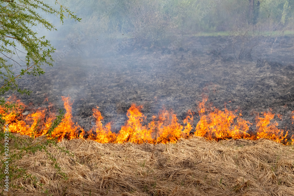 fire in a field, fire spreading through dry grass and vegetation, with visible flames and smoke