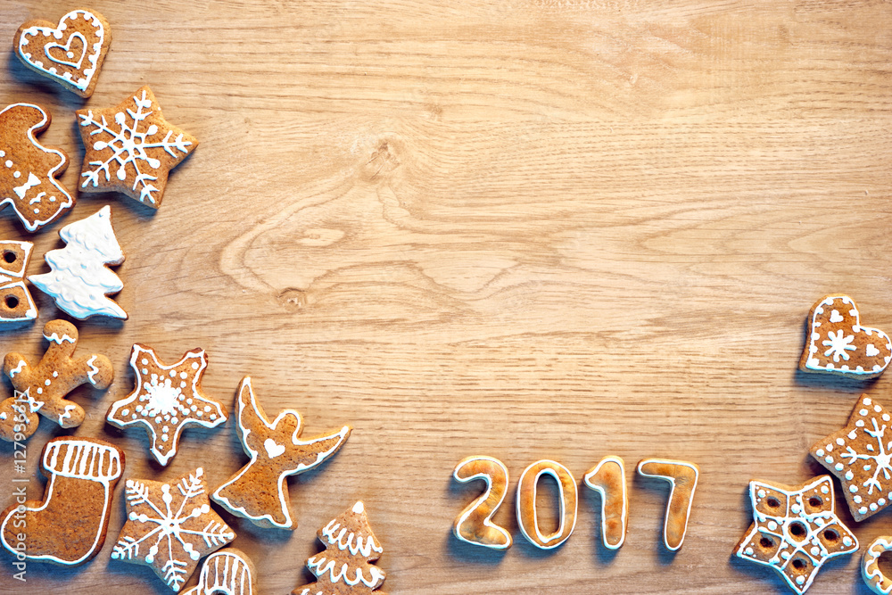 Merry X-mas! Homemade cookies on wooden background. Copy space for your text. Top view