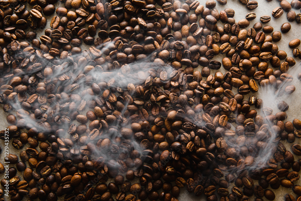 Steaming Roasted Coffee Beans Captured From Above Displaying Freshness and Aroma