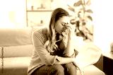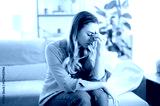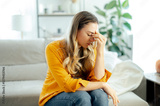 Concept of stress, anxiety, burnout, and mental exhaustion. Exhausted sad caucasian woman in a yellow shirt sitting on a cozy sofa, massaging her nose bridge, having headache or personal problems