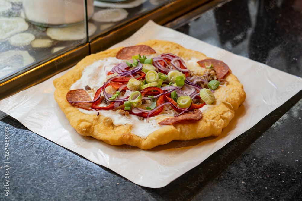 Hungarian style Langos is a fried bread with sour cream, cheese, bell peppers, red onions, salami and bacon.