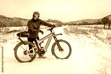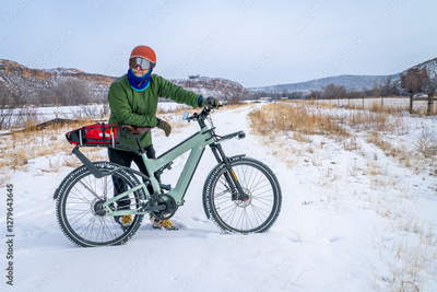 happy senior male cyclist with a touring electric bike in Colorado foothiils in winter scenery