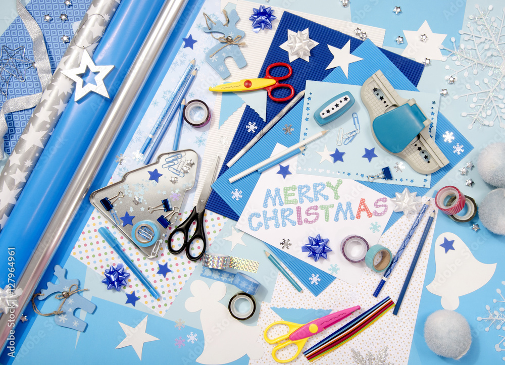 Arts and craft supplies for Christmas. Blue color paper, pencils, different washi tapes, craft scissors, wrapping paper rolls, festive Xmas supplies for decoration. Merry Christmas paper sign.