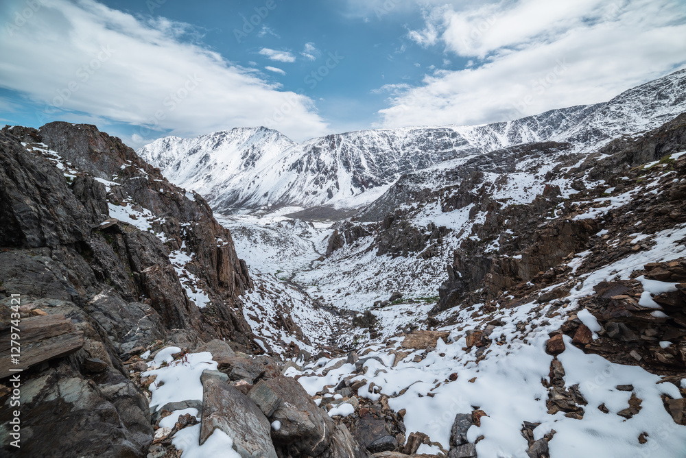 Descent along thin rocky gorge down into snow-covered alpine valley. Landscape from above to snowy stony couloir. White snow on stones in high mountains. Top view to snow-white steep slope among rocks