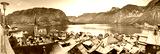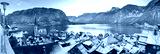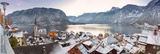 Picturesque winter sunrise in Hallstatt, Austria, overlooking lake and snow-covered rooftops