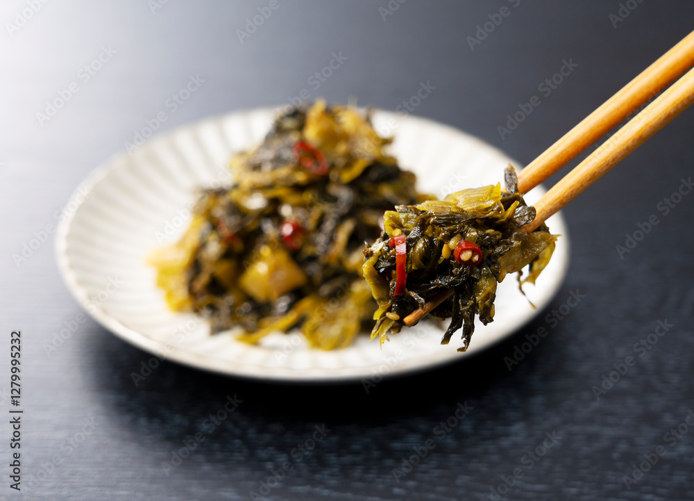 Lifting Karashi Takana with Chopsticks on a Black Background – Karashi Takana: A Japanese-Style Pickle Made from Mustard Greens