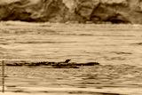 Telephoto of a group of Gentoo Penguins -Pygoscelis papua- jumping and swimming among the Antarctic sea ice. Antarctic Peninsula.