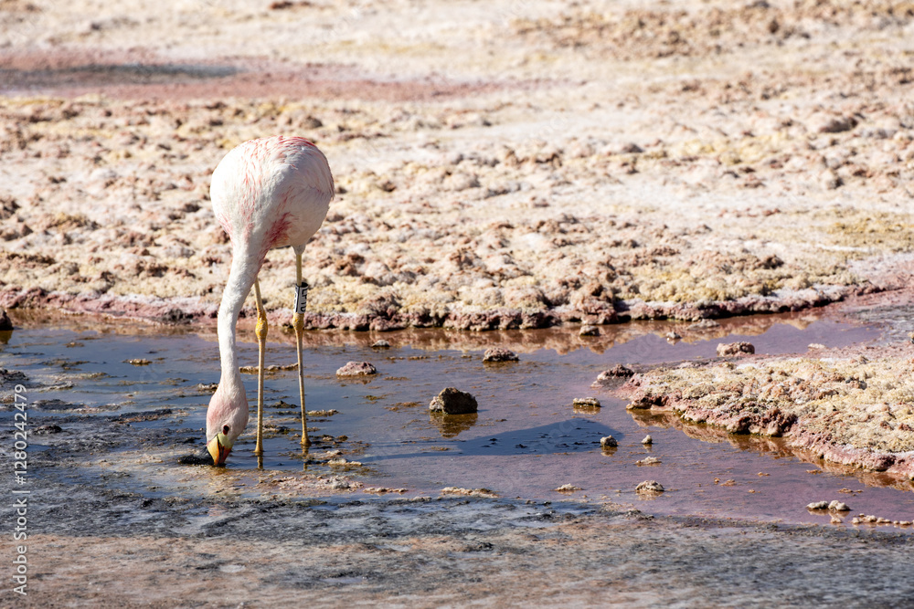 A Flamingo feeding at the Laguna Chaxa. Part of the Los Flamencos National Reserve, Chile.
