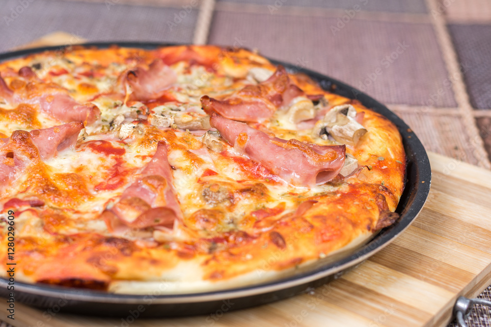 Delicious pizza with ham cheese mushrooms