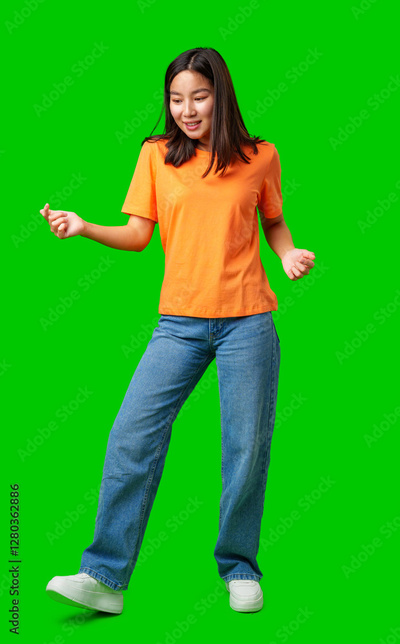 Young woman dancing in an orange shirt and jeans against a vibrant green background