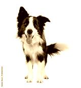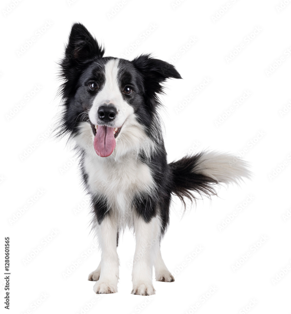 Charismatic typical black and white young adult Border Collie dog, standing up facing front. Looking enthousiastic straight to camera with mouth open panting. Isolated cutout on a transparent backgrou