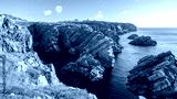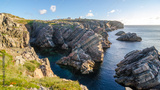 Cape Bona Vista coastline in Newfoundland, Canada. Lighthouse station atop the end of the cape ahead on the horizon.