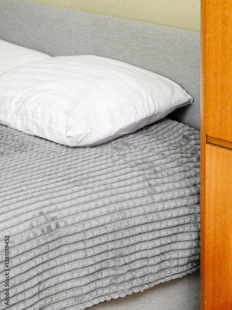A cozy bed that features a soft blanket and a fluffy pillow on it