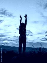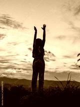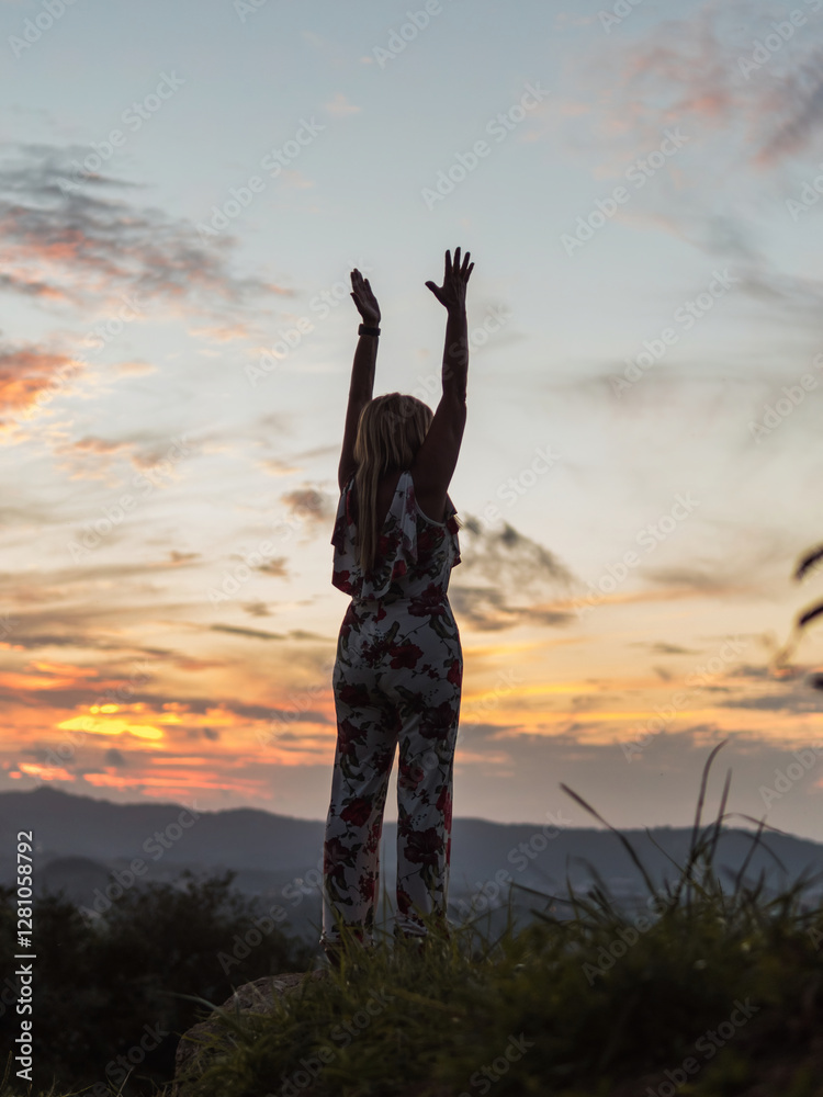 Woman enjoying a vibrant sunset with arms raised in celebration on a scenic hill