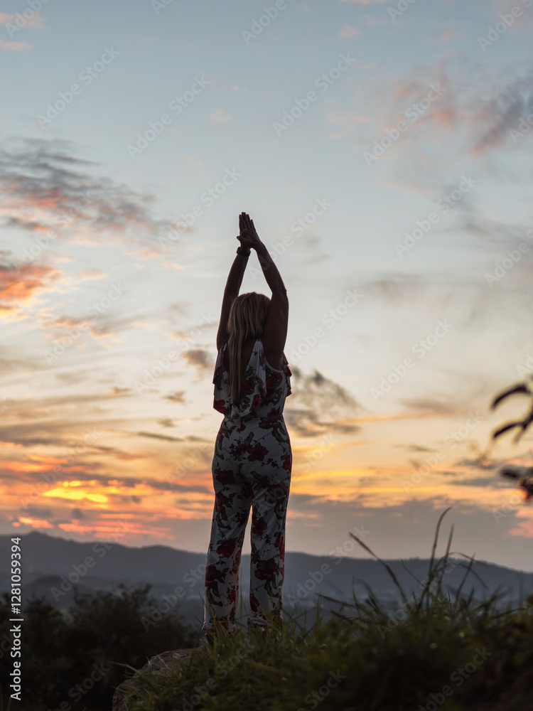 Sunset yoga session in nature with a person stretching in serene surroundings