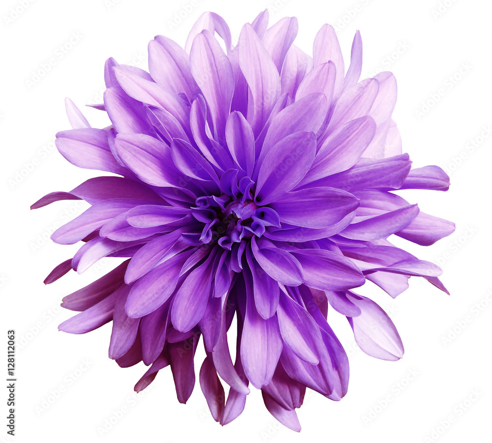 Purple flower on a white background isolated with clipping path. Closeup. Big shaggy flower. Dahlia.