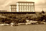 Stuning seascape with a boat sailing in front of Le Palais du Pharo (Pharo Palace) and its gardens in Marseille, France, Europe.