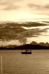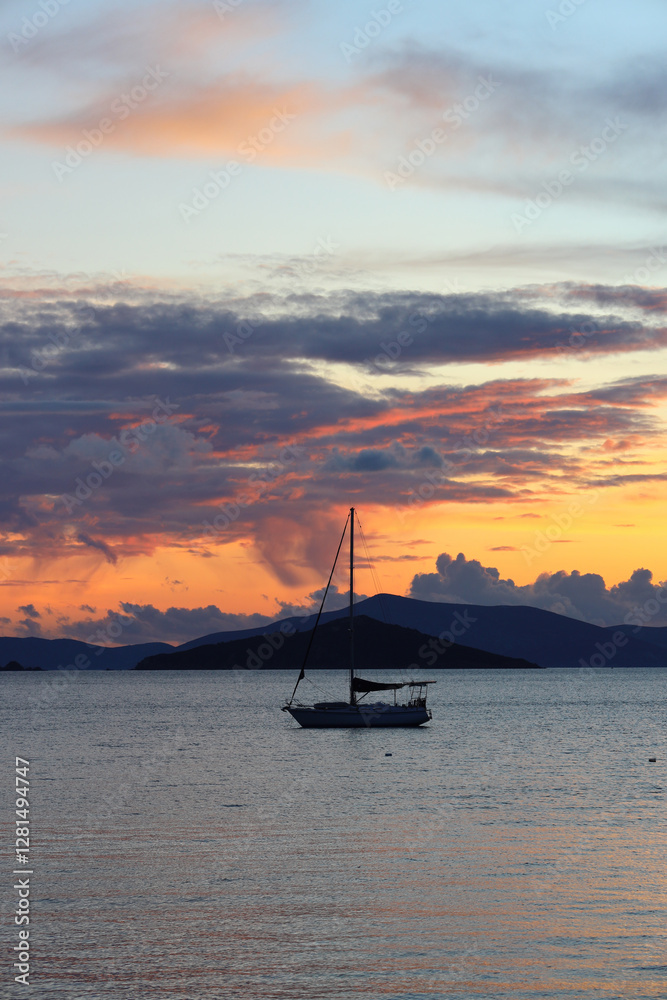 Alone sailboats at sunset. Atmospheric seascape with reflection