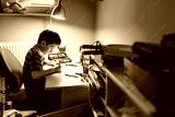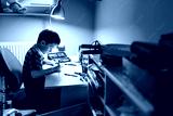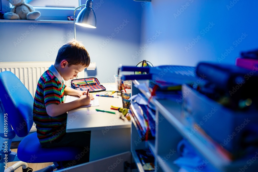 Child is doing homework in the light of the lamp
