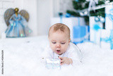 Cute baby boy playing with christmas gift in white room.