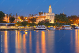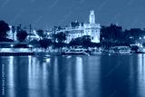Dodecagonal military watchtower Golden Tower or Torre del Oro and Guadalquivir river during evening blue hour, Seville, Andalusia, Spain