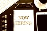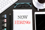 Text Now hiring on white paper background / business concept.