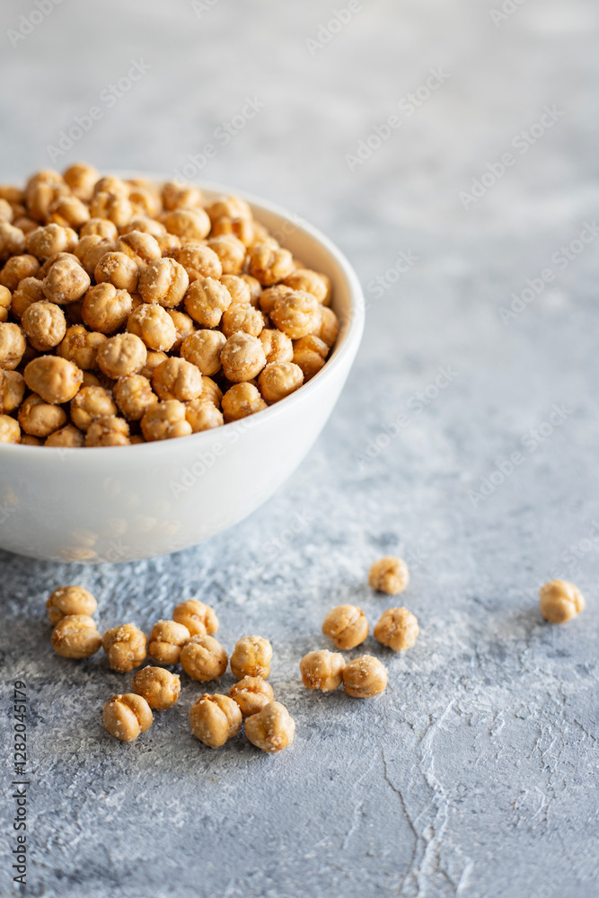 Roasted chickpeas in bowl on wooden background, traditional turkish nut, leblebi