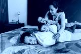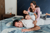 latin family mother and father playing with children on bed at home in Mexico Latin America, hispanic people in pajamas