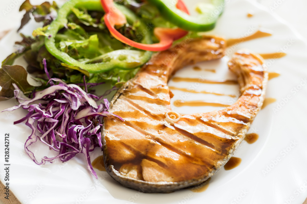 Grilled Teriyaki salmon steak with vegetables