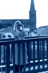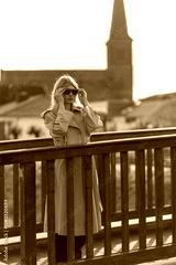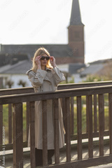 Woman in beige trench coat adjusts sunglasses on wooden bridge in peaceful town setting