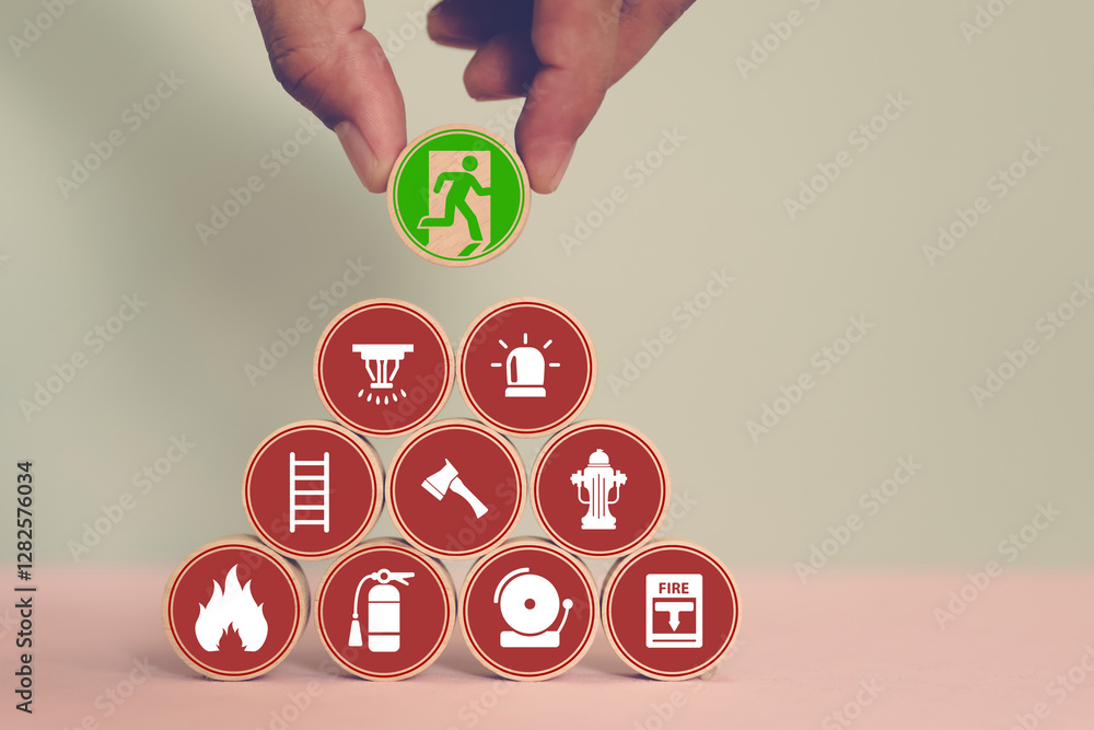 Hand choose fire door exit sing escape on wooden toy stack with for prevent and fire extinguisher and emergency prevention or protection symbol for safety first and rescue and training concepts.