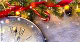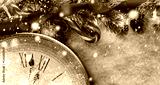 Countdown to midnight. Retro style clock counting last moments before Christmas or New Year 2017 next to decorated fir tree. View from above.