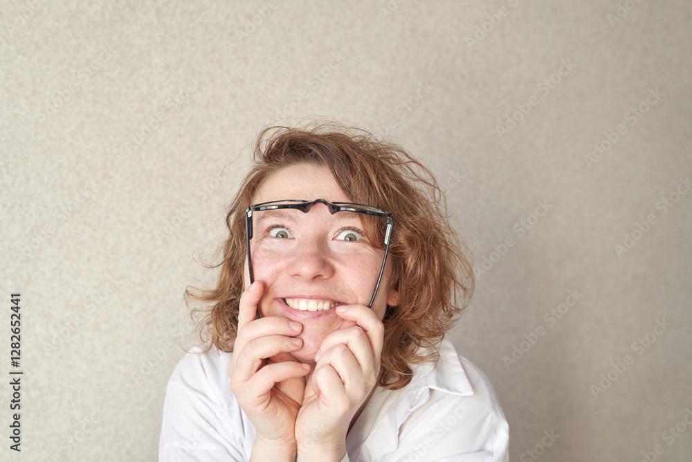 Caucasian female adult with glasses making a silly face in a white shirt against a neutral background.