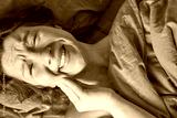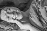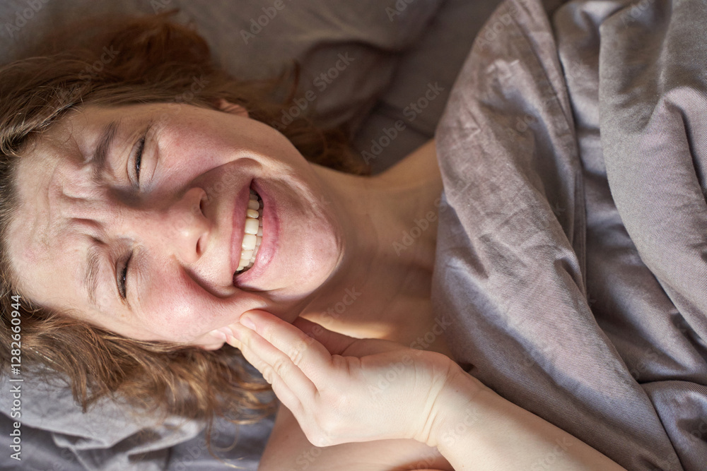 Caucasian young female waking up smiling in bed under grey blanket morning happiness.
