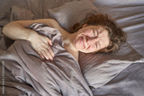 Young caucasian female waking up in bed with pained expression on face in morning light.
