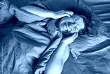 Mature caucasian female joyfully lying in bed under gray sheets smiling with eyes closed.
