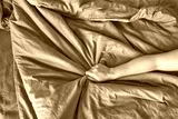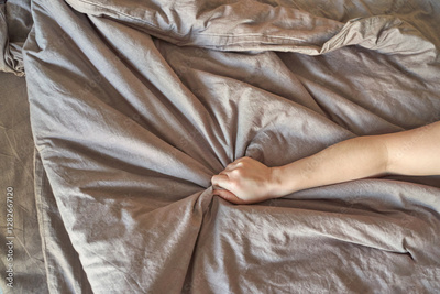 Close up of hand gripping beige bedsheet showing crumpled fabric texture and natural light.