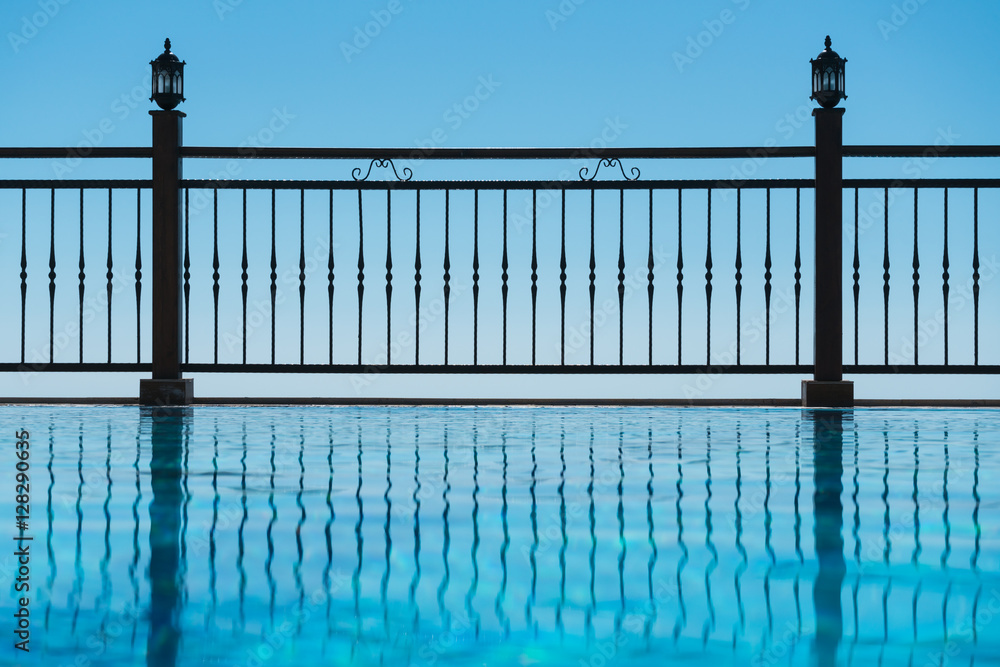Fence of the resort pool with a pair of lanterns on the columns reflected in the water. Pure blue sky on the background. Sunny day.