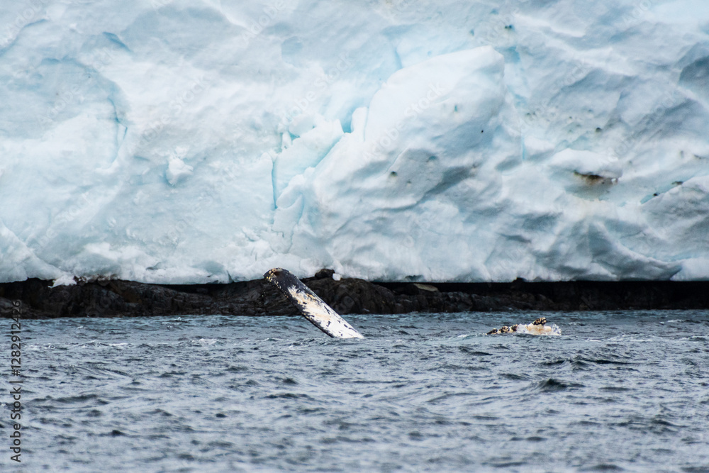 Close-up of the lateral fin of a feeding Humpback Whale -Megaptera novaeangliae- agains the background of a Glacier, near Graham passage and Charlotte Bay on the Antarctic Peninsula
