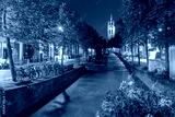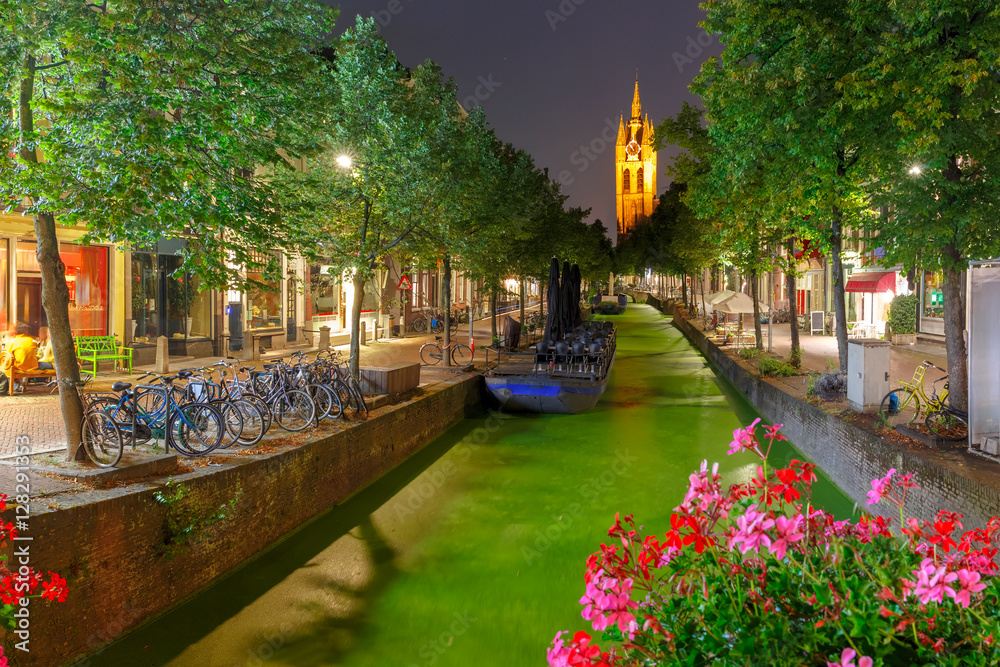 Oude Delft canal and leaning tower of Gothic Protestant Oude Kerk church at night, Delft, Holland, Netherlands