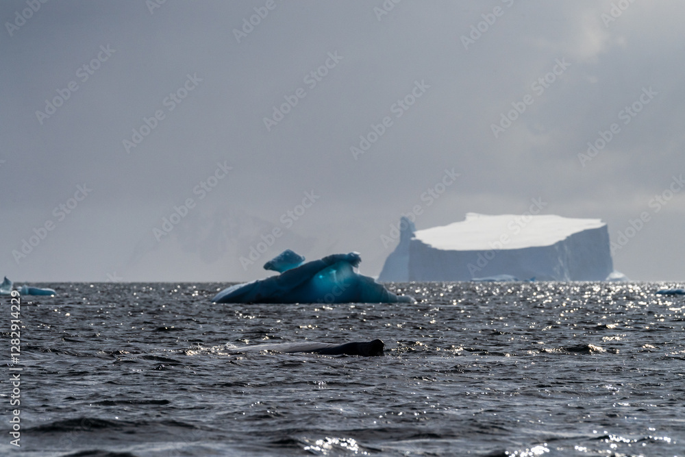 Close-up of the back and dorsal fin of a diving humpback whale -Megaptera novaeangliae. Image taken in the Graham passage, near Charlotte Bay, Antarctic Peninsula