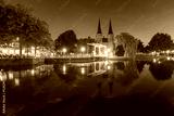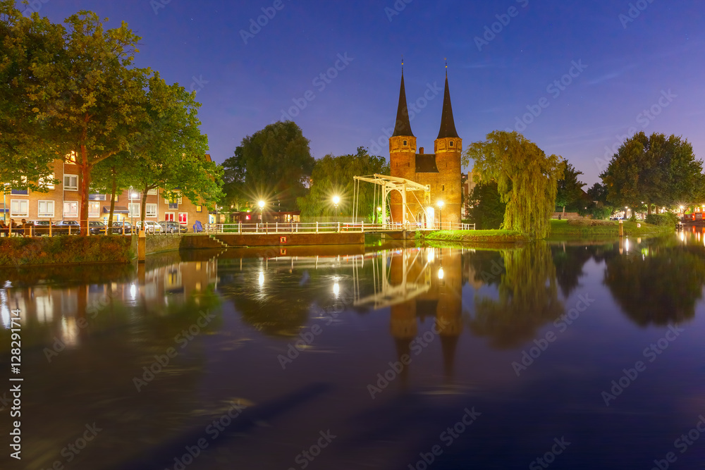 Eastern Gate, Oostpoort, with the white draw bridge, along Delftse Schie canal at night, Delft, Holland, Netherlands