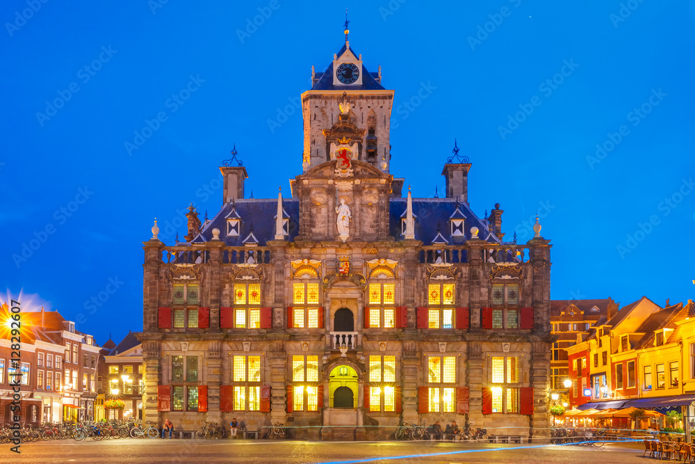 City Hall on the Markt square in the center of the old city at night, Delft, Holland, Netherlands