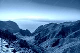 Blick über das Tenogebirge im Westen der Kanareninsel Teneriffa auf die Nachbarinsel La Gomera, Spanien
