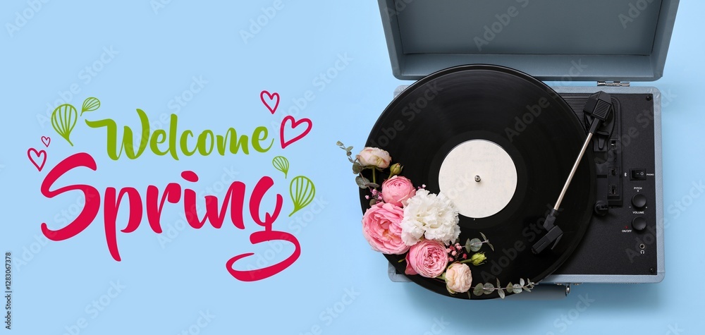 Banner with text HELLO SPRING, vintage music record player and flowers