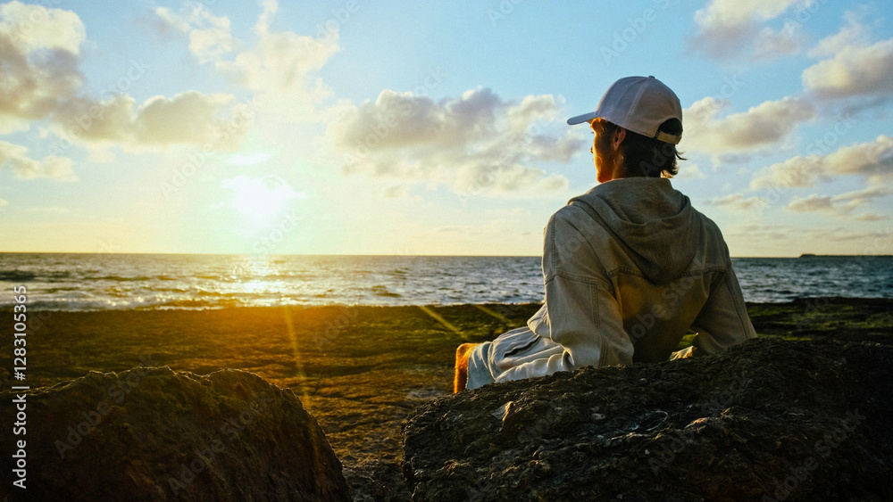 Man on a beach is looking distance during beautiful summer sunset. Human looks to the sun over horizon in the morning while sunrise. Happy person contemplates the beauty of nature. Freedom concept.